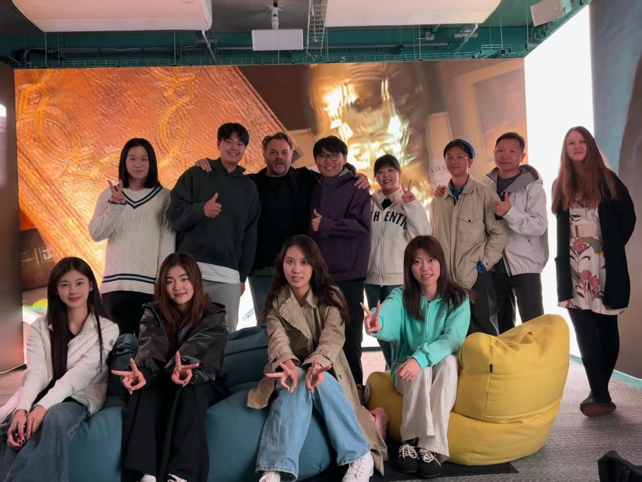 出访团参加由Timi与Kylie老师主导的数字交互沉浸式体验课程。课程以“设计师作为故事讲述者”为主题,鼓励学生跳脱固有思维,融合东西方艺术元素,通过三面多媒体屏幕构建叙事逻辑,完成挑战任务。这一创新教学模式激发了学生对信息整合与故事表达的深度思考。