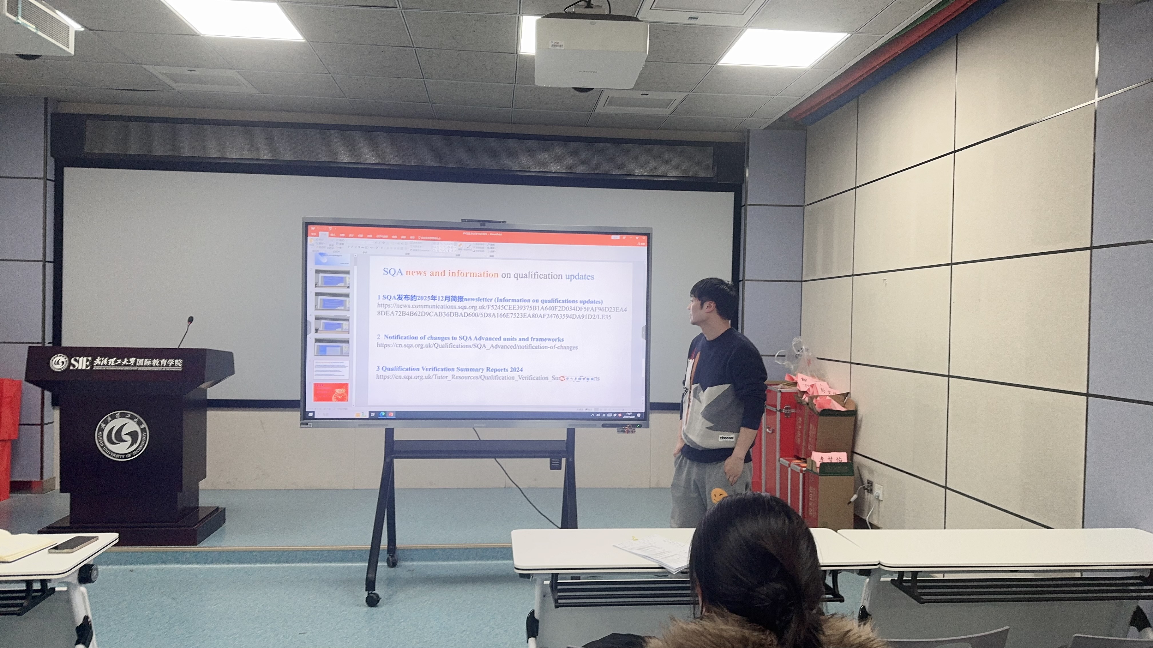 为迎接苏格兰学历管理委员会SQA项目年度外审工作,进一步提升商科专业教学质量与国际化办学水平,2025年12月31日下午,武汉理工大学国际教育学院商科教研室在学院506会议室组织开展了“SQA内外审专项培训”活动。本次培训聚焦会计专业外审准备、SQA最新评审标准解读及课程内审规范,旨在统一思想、明确任务、夯实基础,确保内外审工作顺利通过。培训由商科教研室主任周欣老师主持,全体商科教师参加,培训内容分为三个板块,层层递进,全面覆盖外审工作的关键环节。