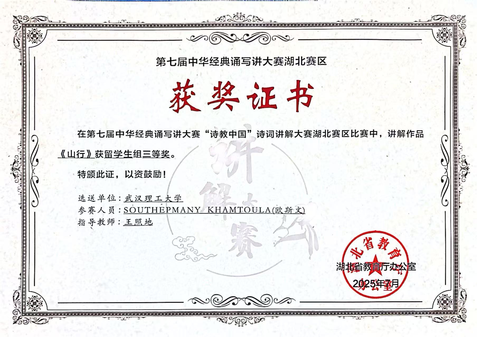我校老挝留学生欧斯文获第七届中华经典诵写讲大赛“诗教中国”湖北赛区三等奖