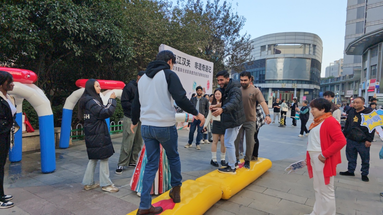 户外广场上的趣味运动会将活动推向高潮。“同舟共济”则考验团队协作,现场欢呼声、加油声此起彼伏。这场轻松愉快的体育互动持续了近四十分钟,留学生们在运动中增进了友谊,打破了文化隔阂,欢声笑语洋溢在整个社区广场。