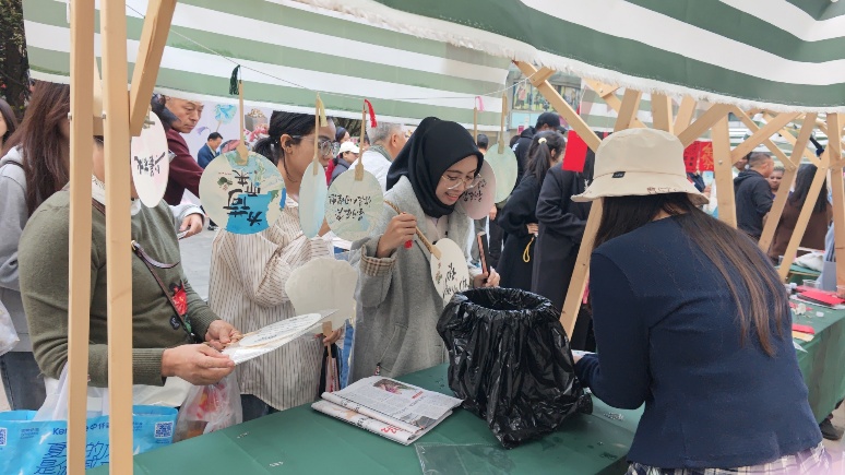 漆扇制作与红包拓印区也吸引了不少学生参与。他们在水中勾勒扇面图案,在雕版上拓印吉祥纹样,在动手实践中领略东方美学的意境与韵味。中医文化体验区为留学生们提供了别开生面的文化接触。大家在中医师的指导下体验脉诊,品尝养生茶饮,对中医“治未病”的理念有了初步了解。