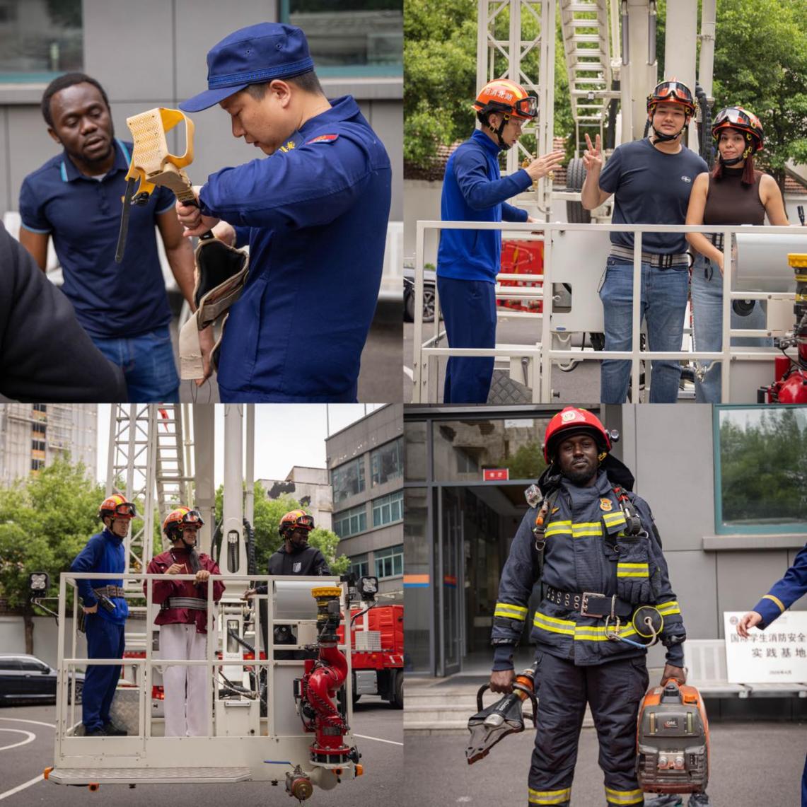 本次消防安全教育活动的核心环节为消防实践体验。在消防员的专业指导下,国际学生们亲身参与了多项实践活动:乘坐登高平台消防车,俯瞰周边环境,真切感受消防救援的高空作业视角;亲手穿上消防服,体验消防员执勤时的着装规范,体会这份职业的责任与重量;在消防员的示范教学下,学习常用消防器材的使用方法,掌握了基础的灭火技能。实践过程中,国际学生们热情高涨、积极参与,在亲身体验中深化了对消防安全知识的理解。