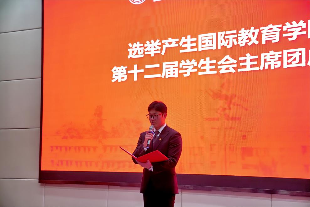 大会在庄严的国歌声中拉开序幕。石虎首先对过去一年里国际教育学院学子取得的各项成果给予了充分肯定和高度认可,同时向全体代表提出三点要求与希望:一是坚定理想信念,做新时代的追梦人。要深入学习贯彻先进思想,以实现中华民族伟大复兴为己任。二要勤奋学习,做本领过硬的实干家。三是要牢记宗旨,做服务同学的贴心人。作为学生代表,要发挥好桥梁纽带作用,既要倾听同学的声音,切实维护同学的合法权益,还要将学校和学院的政策措施传达给同学们。
