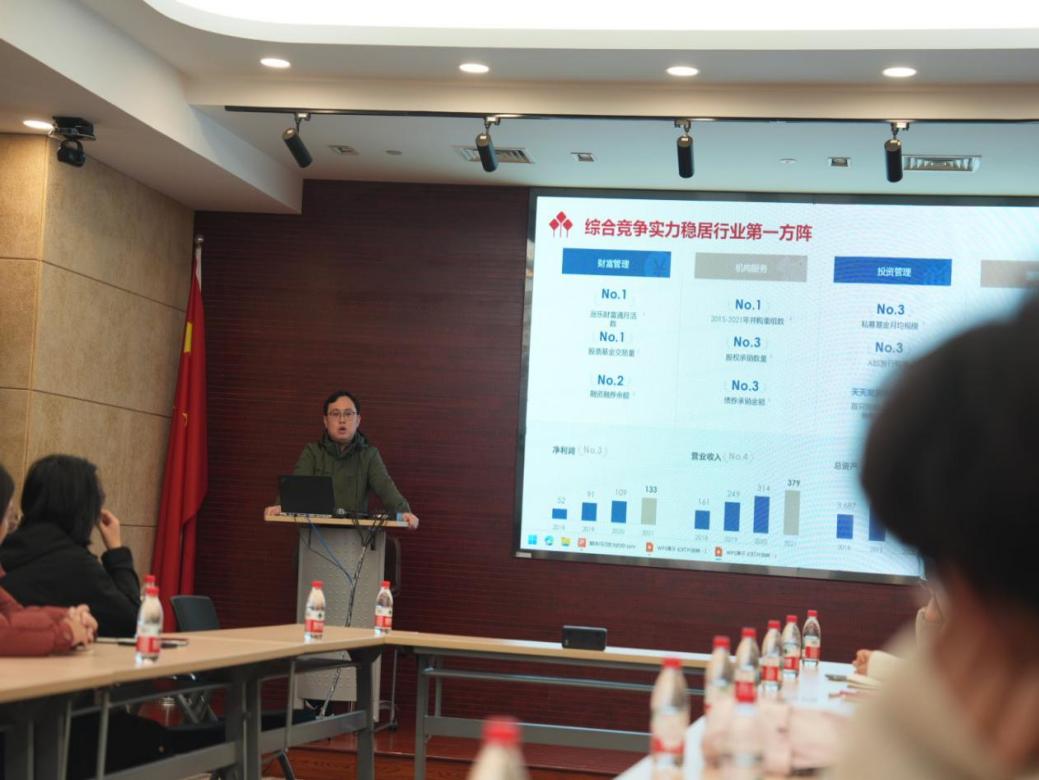 活动伊始,华泰证券湖北分公司私行中心财富精耕团队队长王欣茂,结合华泰证券的发展历程,带领同学们回顾了公司自成立以来的重要发展阶段与行业贡献。同时,他系统说明了证券公司前、中、后台的职能划分与实习机会,并表示“不同岗位对人才的能力要求各有侧重”,鼓励同学们根据自身兴趣与特长进行职业规划。