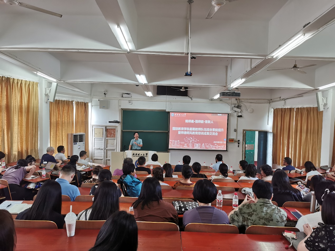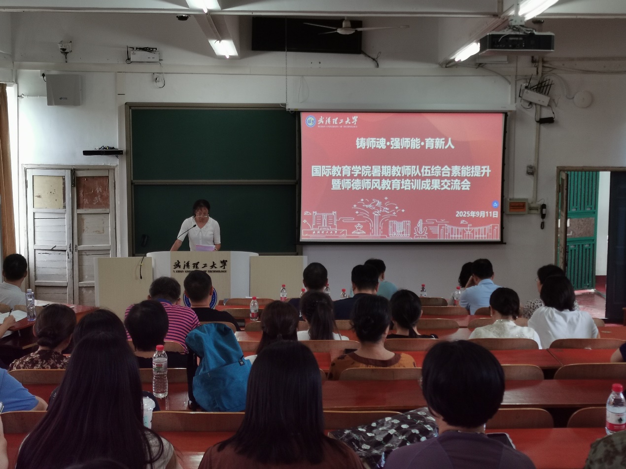 为大力弘扬教育家精神,贯彻落实习近平总书记关于教育的重要论述,围绕学校第41个教师节系列纪念活动主题,9月11日下午2点半,国际教育学院在弘毅楼501阶梯教室召开“铸师魂·强师能·育新人”——暑期教师队伍综合素能提升暨师德师风教育培训成果交流会。全院教职工参会,会议由学院副院长钟鸣主持。