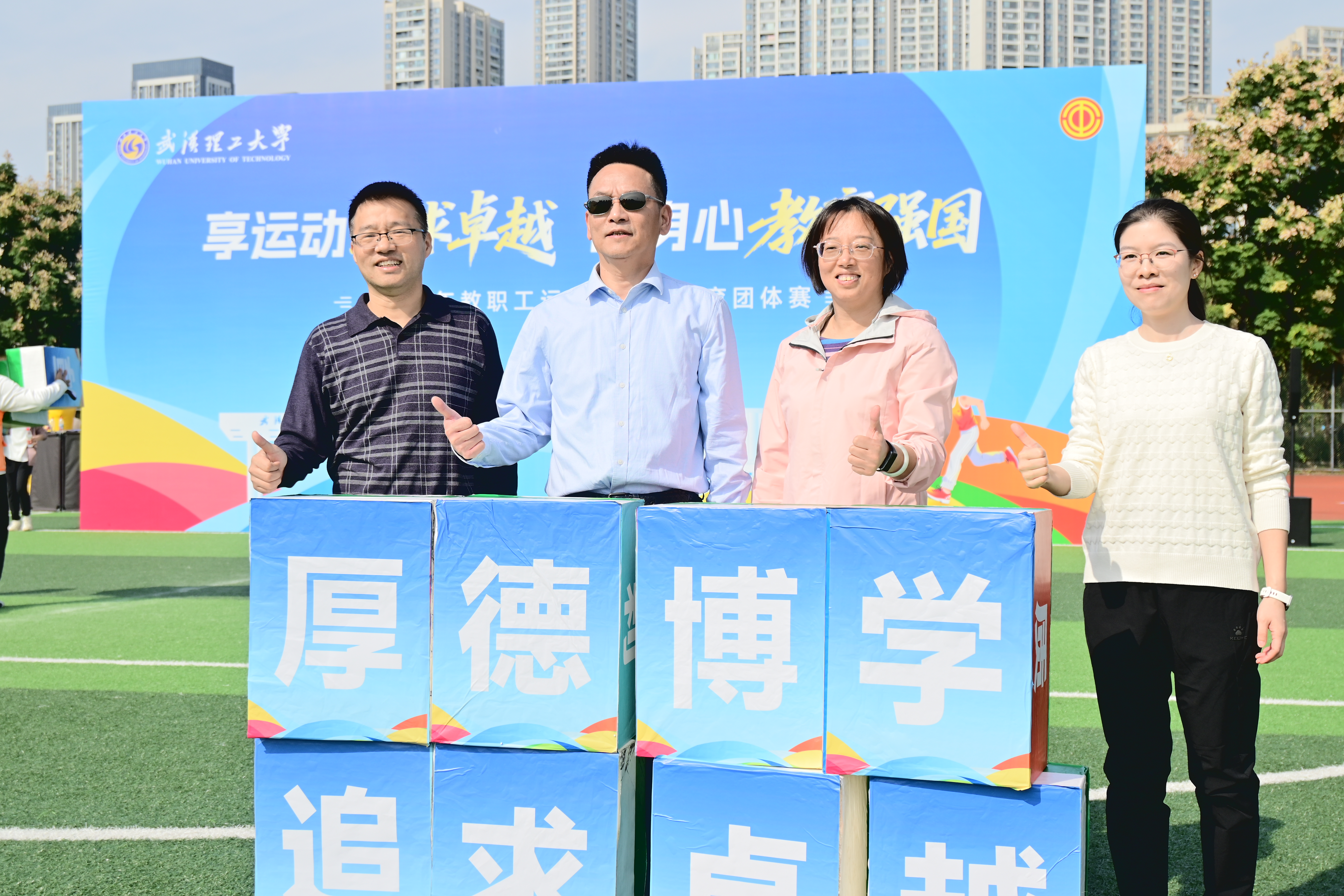 在副田径场上,教职工运动会火热开展。平日里认真严谨的老师们如今也展露出活泼可爱的一面,热情似火地投入到各项比赛中。在“汉诺塔”“合作共赢”等项目中,老师们齐心协力,奋勇争先。