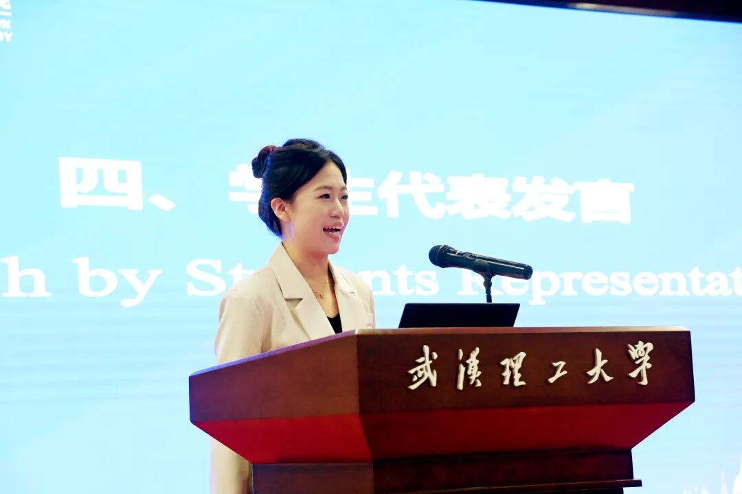 国际贸易2304班董昱佳作为学生代表分享了她的成长历程。从初入校园时的探索求知,到斩获“认知中国符号,讲好中国故事”全国总决赛“最佳表达奖”,再到通过赴英研学全面提升跨文化沟通能力,她以亲身经历诠释了武汉理工大学“融通中外、赋能成长”的育人理念,展现了新时代青年学子扎根中国、放眼世界的精神风貌。