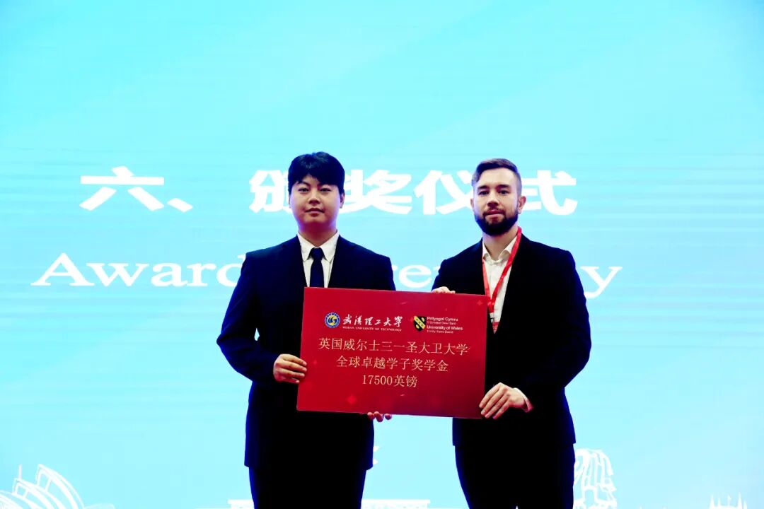 在颁奖环节,英国威尔士三一圣大卫大学为数字媒体艺术 2203 班谢博林同学颁发“全球卓越学子奖学金”,全额减免其硕士阶段17500 英镑学费。这一荣誉既是对学生个人综合素质的高度认可,更是海外院校对武汉理工大学国际化育人成果的充分肯定。
