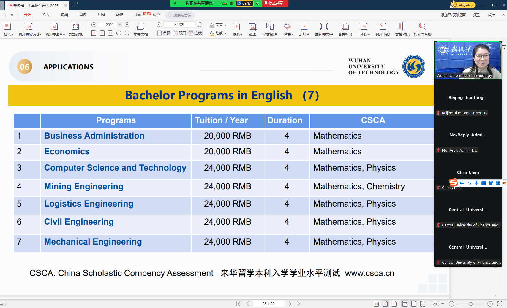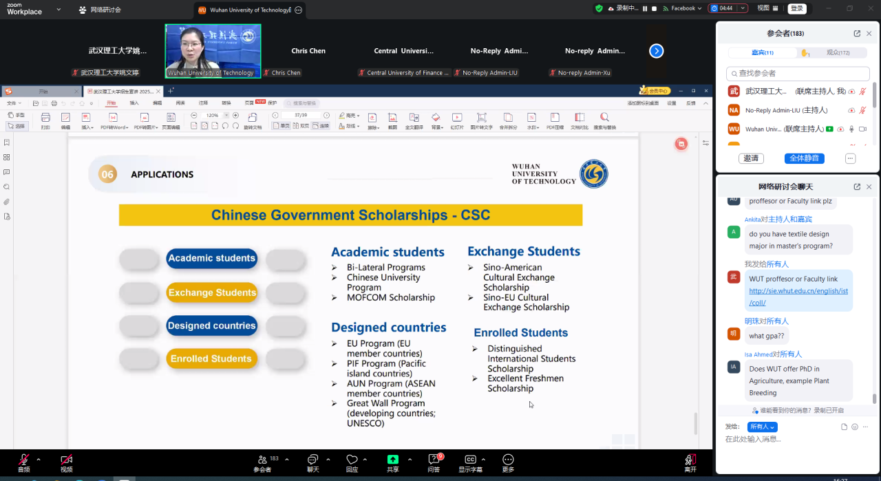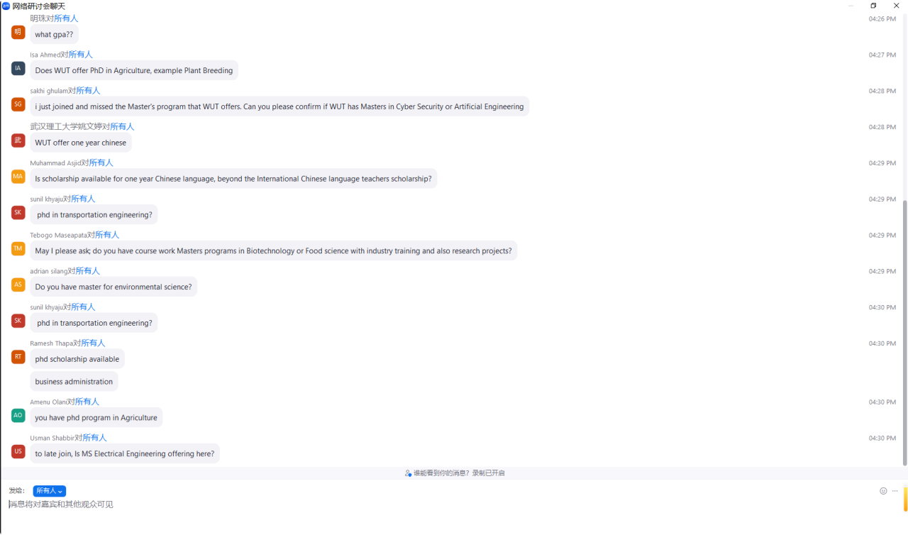 为落实学校“4310”国际化行动计划,促进“留学武理”品牌建设及宣传,国际教育学院留学生招生与培养中心参加了中国教育国际交流协会组织的2025年度大型线上直播与推介活动,于12月18日下午通过Zoom直播平台以线上宣讲方式面向国际学生介绍我校办学历史、优势专业、特色课程和2026年的招生政策,并与直播间的意向申请人进行答疑互动。