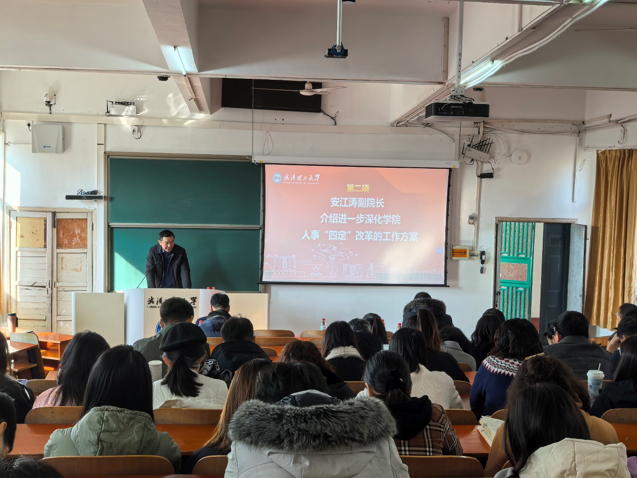 学院副院长安江涛就进一步深化学院人事“四定”改革的工作方案作专题介绍。他指出,2026年学院将全面实施人事“四定”改革,本次改革秉持“尊重现状、稳步快跑”的根本原则,突出“多劳者多得、绩高者多得、创新者多得”三大激励标准及核心导向,旨在充分调动教职工的工作积极性和创新性。同时,安院长就2026年学院人事“四定”改革工作的推进时间与阶段性任务作出了具体安排,以确保改革有序推进、落地见效。