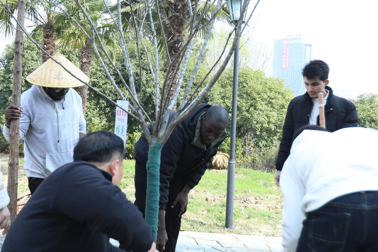 活动现场,师生们分工协作、默契配合:挥锹铲土、扶苗定植、提桶浇水,每一个环节都认真细致。来自不同国家的留学生与中国学子并肩劳作,在一铲一培间传递友谊,在共植新绿中凝聚情谊。
