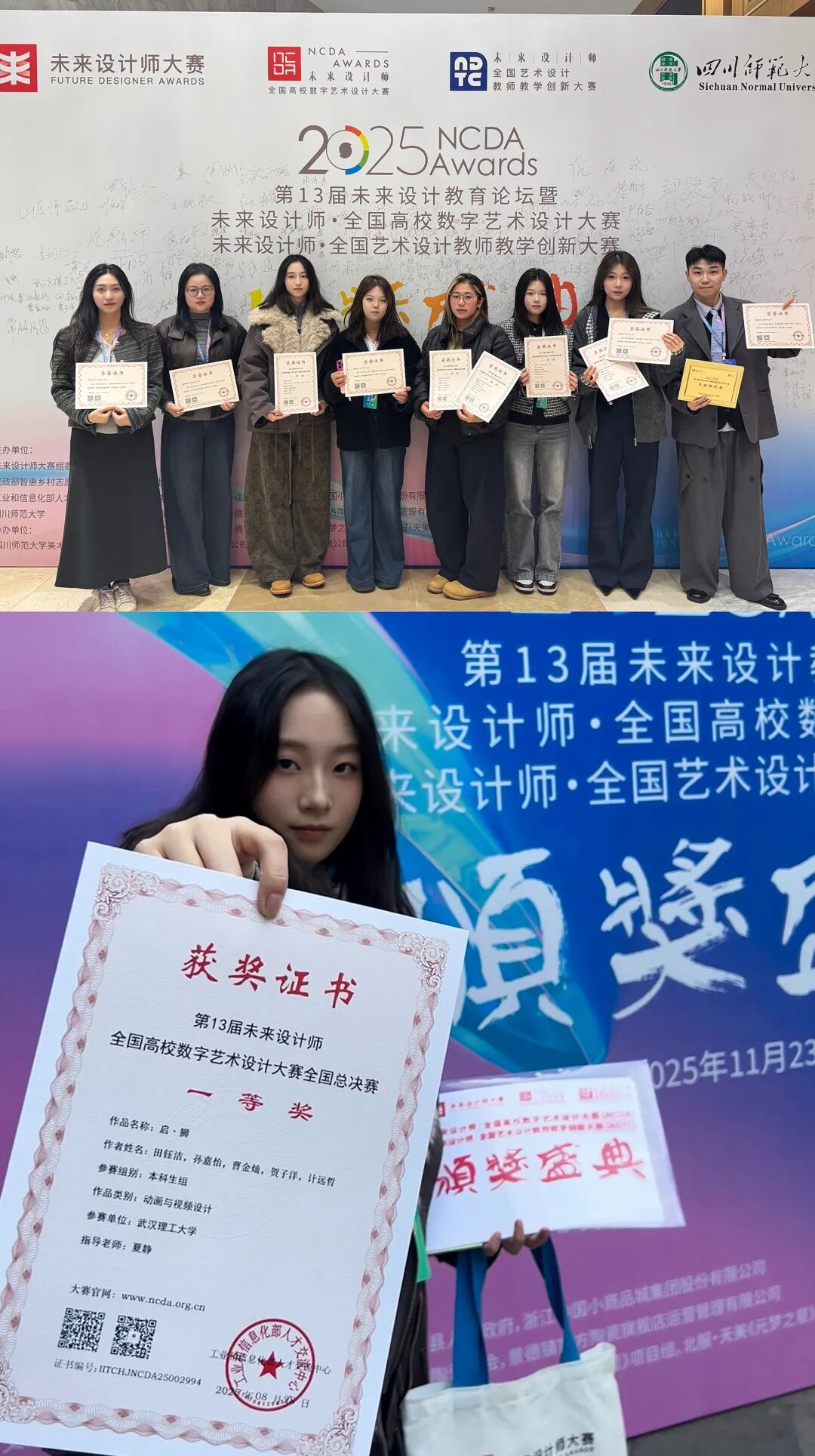 近日,第十三届未来设计师·全国高校数字艺术设计大赛(NCDA)颁奖典礼圆满举行。武汉理工大学国际教育学院艺术项目在本届大赛中表现卓越,共斩获7项国家级奖项,包括两项国赛一等奖、两项国赛二等奖和三项国赛三等奖,数量及质量均取得历史性突破,师生代表受邀出席典礼。