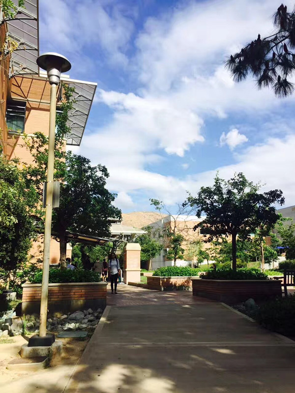 我是2017年8月抵达加州洛杉矶,那正是烈日炎炎之际,飞机上俯视整个城市,满眼的是如稻田般规划整齐的房屋,房屋都不高不超过3层,和我想象中高楼大厦,繁华街市完全不一样,河滨这个城市不大不小,安静祥和,是个适宜居住的好地方。坐上接新生的白老师的车上,才慢慢平缓了远离家乡颠簸12小时飞机的疲倦和紧张。驶上高速公路,道路宽敞平和,简直不敢相信这些高速公路是上个世纪80年代的产物,虽然没有沥青铺路,但也让人感受不到这条道路的年代感。一路上的风景对我来说有些新奇,我第一次在群山环绕的城市里居住,看不到高楼耸立,入眼的全是连绵起伏的山落。我选择住宿在学生公寓international village,三栋三层楼连成一排的公寓围出了一片小广场,装点上石桌喷泉,让人一眼望去心旷神怡,瞬间对未来的一年学习生活都充满信心。